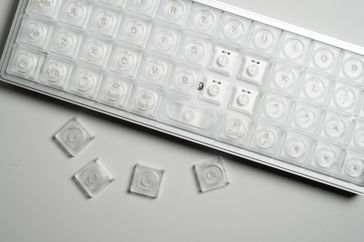 キーキャップが特徴的で、半透明のスケルトン仕様。LAKロープロファイルのPCプラスチック製です。