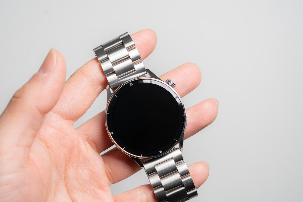 サファイアガラスを使用した1.43インチAMOLEDディスプレイに、ステンレススチール製の本体。回転式クラウンとサイドボタンを搭載したシンプルなデザインは、スタイリッシュで高級感があります。純粋にデザインがいいから時計として使いたくなりますね。